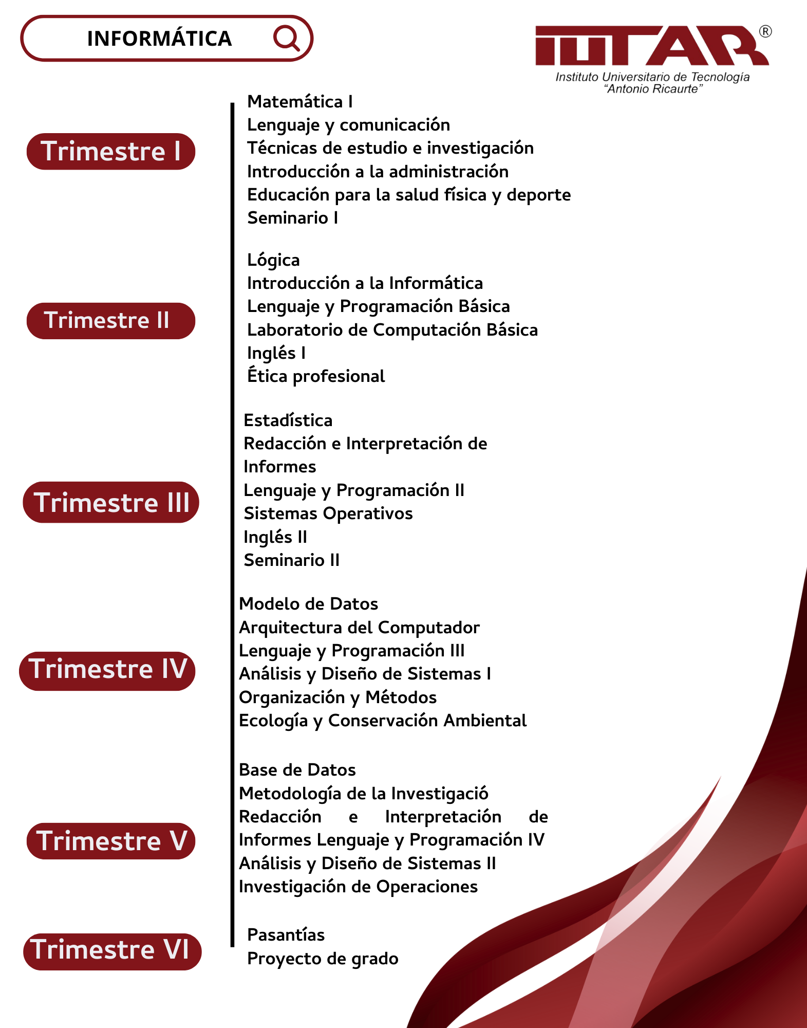 El Técnico Superior Universitario en Informática diseña y desarrolla programas de aplicación para el sector productivo; diseña y aplica nuevas metodologías para la construcción de paquetes de programación. Realiza funciones administrativas en empresas relacionadas con la producción y servicios de computación, diseña y maneja sistemas de base de datos. Este profesional tiene la capacidad de dirigir y supervisar la selección, montaje y operación de sistemas de computación, revisar, validar y controlar la recolección, clasificación y procesamiento de los datos requeridos por los sistemas de información de la institución donde se desempeña; así como define políticas y toma de decisiones estratégicas que permitan integrar todos los procesos y sistemas.